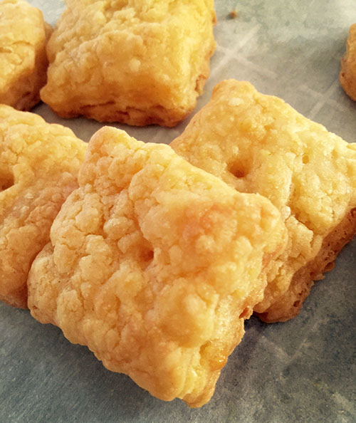 [I] had seen a couple of TV cooks make crackers that strongly resembled Cheez-Its, down to the little center hole. I was intrigued and also a little hesitant…cutting out a million little squares seemed tedious, and again, I have the straightness issue. But my curiosity to try them finally won out.